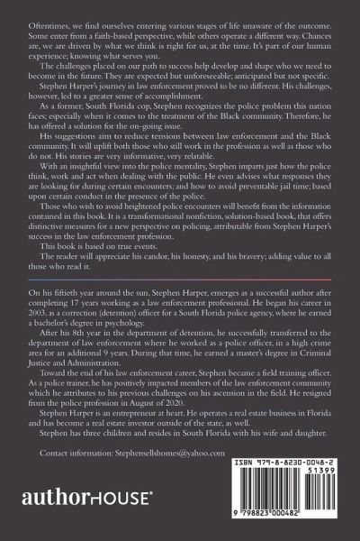 Oftentimes, we find ourselves entering various stages of life unaware of the outcome. Some enter from a faith-based perspective, while others operate a different way. Chances are, we are driven by what we think is right for us, at the time. It's part of our human experience; knowing what serves you. The challenges placed on our path to success help develop and shape who we need to become in the future. They are expected but unforeseeable; anticipated but not specific. Stephen Harper's journey in law enforcement proved to be no different. His challenges, however, led to a greater sense of accomplishment. As a former, South Florida cop, Stephen recognizes the police problem this nation faces; especially when it comes to the treatment of the Black community. Therefore, he has offered a solution for the on-going issue. His suggestions aim to reduce tensions between law enforcement and the Black community. It will uplift both those who still work in the profession as well as those who do not. His stories are very informative, very relatable. With an insightful view into the police mentality, Stephen imparts just how the police think, work and act when dealing with the public. He even advises what responses they are looking for during certain encounters; and how to avoid preventable jail time; based upon certain conduct in the presence of the police. Those who wish to avoid heightened police encounters will benefit from the information contained in this book. It is a transformational nonfiction, solution-based book, that offers distinctive measures for a new perspective on policing, attributable from Stephen Harper's success in the law enforcement profession. This book is based on true events. The reader will appreciate his candor, his honesty, and his bravery; adding value to all those who read it.