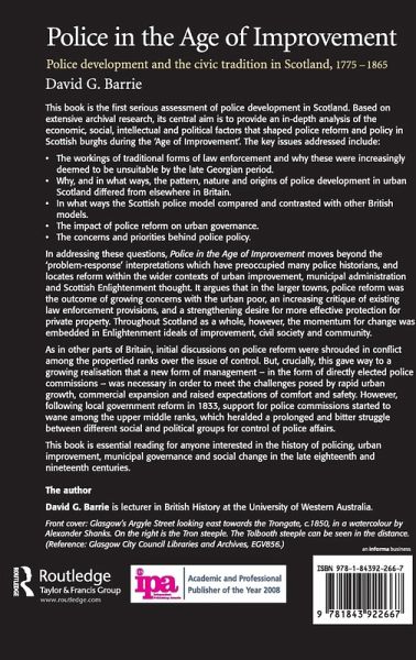 Based on extensive archival research, its central aim is to provide an in-depth analysis of the economic, social, intellectual and political factors that shaped police reform, development and policy in Scottish burghs during the 'Age of Improvement'. The key issues addressed include: the workings of traditional forms of law enforcement and why these were increasingly deemed to be unsuitable by the late eighteenth and early nineteenth centuries; why, and in what ways, the pattern, nature and origins of police development in urban Scotland differed from elsewhere in Britain; in what ways the Scottish police model compared and contrasted with other British models; the impact of police reform on urban governance and the struggle between social groups for control of the local state; the concerns and priorities behind police policy.