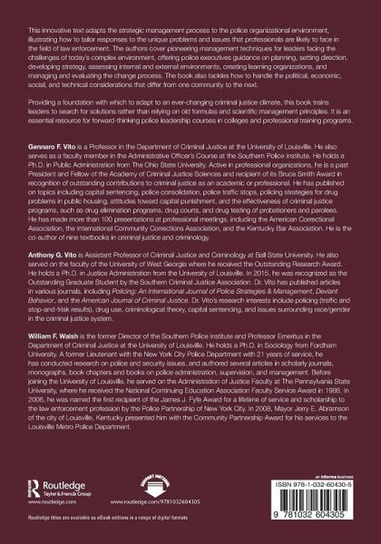 Gennaro F. Vito is a Professor in the Department of Criminal Justice at the University of Louisville. He also serves as a faculty member in the Administrative Officer's Course at the Southern Police Institute. He holds a Ph.D. in Public Administration from The Ohio State University. Active in professional organizations, he is a past President and Fellow of the Academy of Criminal Justice Sciences and recipient of its Bruce Smith Award in recognition of outstanding contributions to criminal justice as an academic or professional. He has published on topics including capital sentencing, police consolidation, police traffic stops, policing strategies for drug problems in public housing, attitudes toward capital punishment, and the effectiveness of criminal justice programs, such as drug elimination programs, drug courts, and drug testing of probationers and parolees. He has made more than 100 presentations at professional meetings, including the American Correctional Association, the International Community Corrections Association, and the Kentucky Bar Association. He is the co-author of nine textbooks in criminal justice and criminology. Anthony G. Vito is Assistant Professor of Criminal Justice and Criminology at Ball State University. He also served on the faculty of the University of West Georgia where he received the Outstanding Research Award. He holds a Ph.D. in Justice Administration from the University of Louisville. In 2015, he was recognized as the Outstanding Graduate Student by the Southern Criminal Justice Association. Dr. Vito has published articles in various journals, including Policing: An International Journal of Police Strategies & Management, Deviant Behavior, and the American Journal of Criminal Justice. Dr. Vito's research interests include policing (traffic and stop-and-frisk results), drug use, criminological theory, capital sentencing, and issues surrounding race/gender in the criminal justice system. William F. Walsh is the former Director of the Southern Police Institute and Professor Emeritus in the Department of Criminal Justice at the University of Louisville. He holds a Ph.D. in Sociology from Fordham University. A former Lieutenant with the New York City Police Department with 21 years of service, he has conducted research on police and security issues, and authored several articles in scholarly journals, monographs, book chapters and books on police administration, supervision, and management. Before joining the University of Louisville, he served on the Administration of Justice Faculty at The Pennsylvania State University, where he received the National Continuing Education Association Faculty Service Award in 1988. In 2006, he was named the first recipient of the James J. Fyfe Award for a lifetime of service and scholarship to the law enforcement profession by the Police Partnership of New York City. In 2008, Mayor Jerry E. Abramson of the city of Louisville, Kentucky presented him with the Community Partnership Award for his services to the Louisville Metro Police Department.