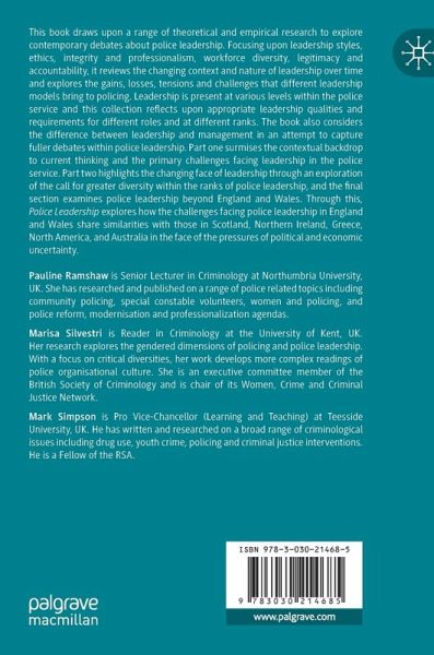 1. Introduction, Pauline Ramshaw, Marisa Silvestri And Mark Simpson.- 2. Ethical Leadership In Policing: Towards A New Evidence-Based, Ethical Professionalism?, Peter Neyroud.- 3. Police Culture And Police Leadership, Tom Cockcroft.- 4. The Art Of 'Flexing'. Translating A New Vision Of Police Leadership From The Top, Pauline Ramshaw And Mark Simpson.- 5. Police Leadership And The Authority Of Rank: A Call For A Critical Perspective, Claire Davis.- 6. In Search Of Diversity: An Embodied Account Of Police Leadership, Marisa Silvestri.- 7. Leadership, Volunteering, And The Special Constabulary, Pauline Ramshaw.- 8. Changes To Police Leadership: The Legitimisation And The Challenges Of Direct Entry, Samantha Scott And Emma Williams.- 9. Contested Spaces: The Politics Of Strategic Police Leadership In Scotland, Kath Murray And Ali Malik.- 10. Leading In Liminal Space: The Challenge Of Policing In Northern Ireland, Joanne Murphy.- 11. The Weight Of History: Politics, Challenges And Leadership Between Tradition And Modernisation In The Hellenic Police, Georgios Papanicolaou.- 12. Police Leadership In The United States, Joseph Schaefer.- 13. Connected Policing: The Importance Of Social Capital And Boundary Spanning In Australian Police Leadership, Victoria Herrington, Deborah Blackman, Jacinta Carroll, And Christine Owen.- 14. Concluding Thoughts, Chief Sara Thornton.