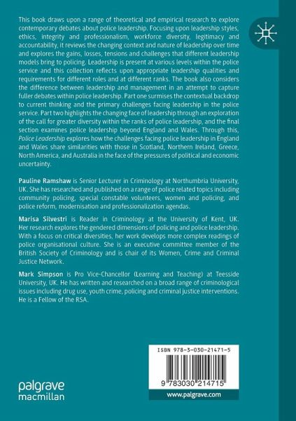 1. Introduction, Pauline Ramshaw, Marisa Silvestri And Mark Simpson.- 2. Ethical Leadership In Policing: Towards A New Evidence-Based, Ethical Professionalism?, Peter Neyroud.- 3. Police Culture And Police Leadership, Tom Cockcroft.- 4. The Art Of 'Flexing'. Translating A New Vision Of Police Leadership From The Top, Pauline Ramshaw And Mark Simpson.- 5. Police Leadership And The Authority Of Rank: A Call For A Critical Perspective, Claire Davis.- 6. In Search Of Diversity: An Embodied Account Of Police Leadership, Marisa Silvestri.- 7. Leadership, Volunteering, And The Special Constabulary, Pauline Ramshaw.- 8. Changes To Police Leadership: The Legitimisation And The Challenges Of Direct Entry, Samantha Scott And Emma Williams.- 9. Contested Spaces: The Politics Of Strategic Police Leadership In Scotland, Kath Murray And Ali Malik.- 10. Leading In Liminal Space: The Challenge Of Policing In Northern Ireland, Joanne Murphy.- 11. The Weight Of History: Politics, Challenges And Leadership Between Tradition And Modernisation In The Hellenic Police, Georgios Papanicolaou.- 12. Police Leadership In The United States, Joseph Schaefer.- 13. Connected Policing: The Importance Of Social Capital And Boundary Spanning In Australian Police Leadership, Victoria Herrington, Deborah Blackman, Jacinta Carroll, And Christine Owen.- 14. Concluding Thoughts, Chief Sara Thornton.