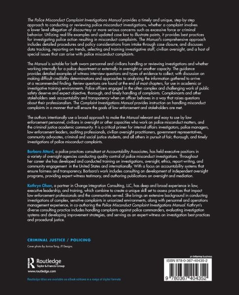 This book provides a step-by-step approach to conducting or reviewing police misconduct investigations, whether a complaint involves a lower level allegation of discourtesy or more serious concerns such as excessive force or criminal behavior.