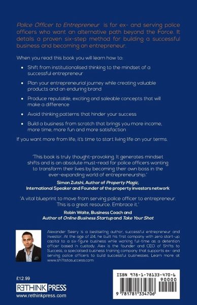 Police Officer to Entrepreneur is for ex- and serving police officers who want an alternative path beyond the Force. It details a proven six-step method for building a successful business and becoming an entrepreneur. When you read this book you will learn how to: • Shift from institutionalised thinking to the mindset of a successful entrepreneur • Plan your entrepreneurial journey while creating valuable products and an enduring brand • Produce reputable, exciting and saleable concepts that will make a difference • Avoid thinking patterns that hinder your success • Build a business from scratch that brings you more income, more time, more fun and more satisfaction If you want more from life, it’s time to start living life on your terms.