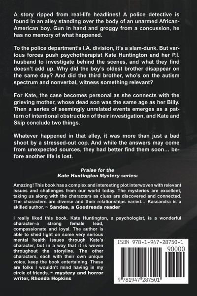 A story ripped from real-life headlines. A police detective is found in an alley, standing over the body of an unarmed African-American boy. Groggy from a concussion, he has no memory of what happened, and he is literally holding the smoking gun. To the Baltimore County Internal Affairs division, it's a slam-dunk. But various forces push psychotherapist Kate Huntington and her P.I. husband to investigate behind the scenes, and what they find doesn't add up. Why did the boy's oldest brother disappear on the same day? And did the third brother, who's on the autism spectrum and nonverbal, witness something relevant? When seemingly unrelated events emerge as a pattern of intentional obstruction and diversion, it becomes apparent that what happened in that alley was more than just a bad shoot by a stressed-out cop. And for Kate, the case has become personal as she's connected with the grieving mother, whose dead son was the same age as her Billy. The answers may come from unexpected sources, but she and Skip better find them soon… before another life is lost.