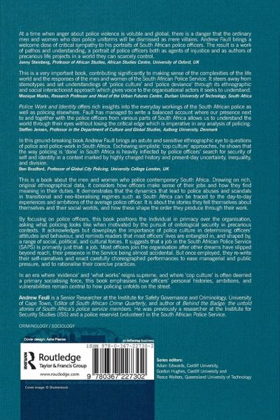 This is a book about the men and women who police contemporary South Africa. Drawing on rich, original ethnographical data, it considers how officers make sense of their jobs and how they find meaning in their duties. It demonstrates that the dynamics that lead to police abuses and scandals in transitional and neo-liberalising regimes such as South Africa can be traced to the day-to-day experiences and ambitions of the average police officer. It is about the stories they tell themselves about themselves and their social worlds, and how these shape the order they produce through their work. By focusing on police officers, this book positions the individual in primacy over the organisation, asking what policing looks like when motivated by the pursuit of ontological security in precarious contexts. It acknowledges but downplays the importance of police culture in determining officers' attitudes and behaviour, and reminds readers that most officers' lives are entangled in, and shaped by a range of social, political and cultural forces. It suggests that a job in the South African Police Service (SAPS) is primarily just that: a job. Most officers join the organisation after other dreams have slipped beyond reach, their presence in the Service being almost accidental. But once employed, they re-write their self-narratives and enact carefully choreographed performances to ease managerial and public pressure, and to rationalize their coercive practices. In an era where 'evidence' and 'what works' reigns supreme, and where 'cop culture' is often deemed a primary socializing force, this book emphasises how officers' personal histories, ambitions, and vulnerabilities remain central to how policing unfolds on the street.