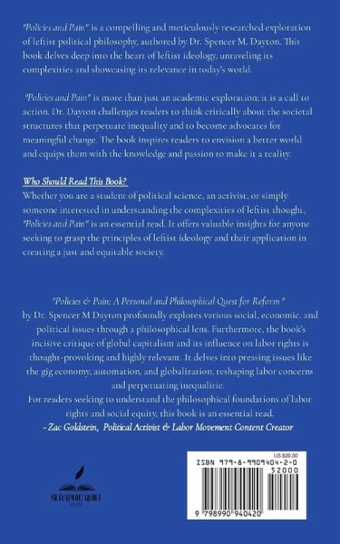 2024 Regal Summit Book Award Winner- 2024 American Writing Awards Finalist- 2024 International Impact Book Award Winner "Policies and Pain" is a compelling and meticulously researched exploration of leftist political philosophy, authored by Dr. Spencer M. Dayton. This book delves deep into the heart of leftist ideology, unraveling its complexities and showcasing its relevance in today's world. Overview In "Policies and Pain," Dr. Dayton takes readers on an intellectual journey through the principles and practices that define leftist thought. With a blend of historical context, theoretical insights, and contemporary analysis, this book provides a thorough understanding of the policies and ideas that have shaped leftist movements across the globe. Personal Narratives and Real-Life Stories "Policies and Pain" is enriched with personal narratives and real-life stories that bring theoretical concepts to life. Through these accounts, readers will gain a profound understanding of the tangible impact of leftist policies on individuals and communities. These stories illustrate the struggles, resilience, and triumphs of those who have fought for and benefited from progressive change. **Historical and Contemporary Analysis** The book provides a balanced mix of historical context and contemporary analysis. By examining the successes and challenges of past leftist movements, as well as the current political landscape, "Policies and Pain" offers a comprehensive perspective on the ongoing relevance of leftist philosophy. A Call to Action "Policies and Pain" is more than just an academic exploration; it is a call to action. Dr. Dayton challenges readers to think critically about the societal structures that perpetuate inequality and to become advocates for meaningful change. The book inspires readers to envision a better world and equips them with the knowledge and passion to make it a reality. **Who Should Read This Book?** Whether you are a student of political science, an activist, or simply someone interested in understanding the complexities of leftist thought, "Policies and Pain" is an essential read. It offers valuable insights for anyone seeking to grasp the principles of leftist ideology and their application in creating a just and equitable society. Conclusion Join Dr. Dayton on this enlightening journey through "Policies and Pain." Discover the power of policies rooted in compassion and justice, and understand how they can transform pain into progress. This book is an invitation to engage with the ideas that have the potential to shape a brighter, fairer future for all.