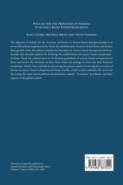 The objective of Policies for the Provision of Finance to Science-Based Entrepreneurship is to survey the policies implemented to foster the establishment of science-based firms and finance their growth. First, the authors examine the literature on science-based entrepreneurial firms. Second, they describe policies for fostering the establishment of science-based entrepreneurial firms. Third, the authors move to the financing problems of science-based entrepreneurial firms and review the literature on how these firms can manage to overcome their financial constraints. Fourth, they conclude by discussing the policies aimed at fostering the provision of finance to science-based entrepreneurial firms. Finally, a brief section concludes the review by discussing the main recent political developments, namely "Trumpism" and Brexit, and their impact on the global market.