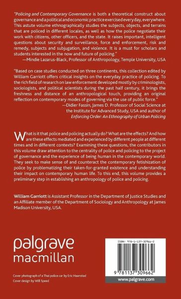 Foreword; John Comaroff Introduction: Police in Practice: Policing and the Project of Contemporary Governance; William Garriott PART I: POLICING THE EVERYDAY 1. Invading the Favela: Echoes of Police Practices Among Brazil's Urban Poor; Benjamin Penglase 2. Policing Methamphetamine: Police Power and the War on Drugs in a Rural US Community; William Garriott PART II: POLICE VIOLENCE 3. Adjusting La Police: the Use of Distance in the Calibration of Legitimate Violence Among the Police Nationale; Kevin Karpiak 4. The Paradox of Police Violence in Democratic Brazil; Teresa Caldeira 5. Dirty Anthropology: Epistemologies of Violence and Ethical Entanglements in Police Ethnography; Beatrice Jauregui PART III: POLICE CULTURE 6. Police as Linking Principle: Rethinking Police Culture in Contemporary Taiwan; Jeffrey T. Martin 7. Thai Police in Refractive Cultural Practice; Eric J Haanstad PART IV: POLICING FUTURES 8. Policing Private Property Against Poverty in Metropolitan Manila; Philip Parnell9. Interpol and the Emergence of Global Policing; Meg Stalcup Afterword; Joseph Masco