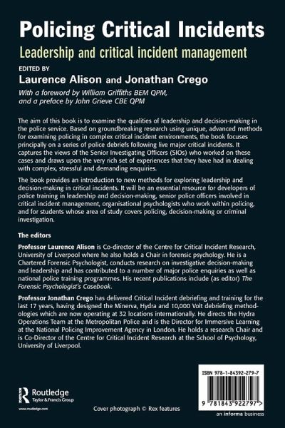 Aims to examine the qualities of leadership and decision making in the police service. Based on research using advanced methods for examining policing in complex critical incident environments, this book focuses principally on a series of police debriefs following live major critical incidents.