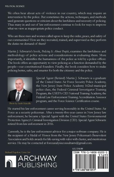 We often hear about acts of violence in our country, which may require an intervention by the police. But sometimes the actions, techniques, and methods used generate questions or criticism about the lawfulness and necessity of policing. Thus many in and out of law enforcement continue to look for ways to improve what we view as inappropriate police conduct. Who are these men and women called upon to keep the order, peace, and safety of our communities? How are they recruited, trained, and supervised as they perform the duties we demand of them? Martin J. Schwartz's book, Policing Is About People, examines the lawfulness and methodology of police actions and considerations in evaluating them. More importantly, it identifies the humanness of the police as told by a police officer. The book offers an opportunity to view policing as a function demanded by the people-our constitutional founders. Finally, the book considers how to make policing better, safer, and smarter for both the citizenry and the police.