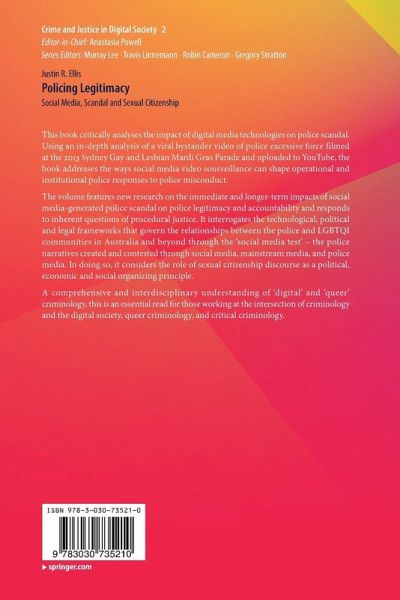 The volume features new research on the immediate and longer-term impacts of social media-generated police scandal on police legitimacy and accountability and responds to inherent questions of procedural justice. It interrogates the technological, political and legal frameworks that govern the relationships between the police and LGBTQI communities in Australia and beyond through the 'social media test' - the police narratives created and contested through social media, mainstream media, and police media. In doing so, it considers the role of sexual citizenship discourse as a political, economic and social organizing principle.