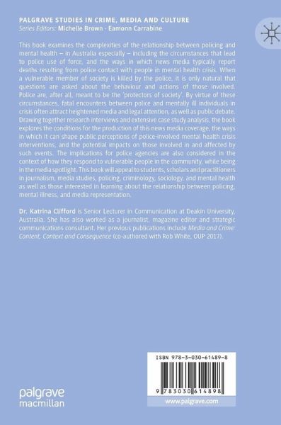 This book examines the complexities of the relationship between policing and mental health - in Australia especially - including the circumstances that lead to police use of force, and the ways in which news media typically report deaths resulting from police contact with people in mental health crisis. When a vulnerable member of society is killed by the police, it is only natural that questions are asked about the behaviour and actions of those involved. Police are, after all, meant to be the 'protectors of society'. By virtue of these circumstances, fatal encounters between police and mentally ill individuals in crisis often attract heightened media and legal attention, as well as public debate. Drawing together research interviews and extensive case study analysis, the book explores the conditions for the production of this news media coverage, the ways in which it can shape public perceptions of police-involved mental health crisis interventions, and the potential impactson those involved in and affected by such events. The implications for police agencies are also considered in the context of how they respond to vulnerable people in the community, while being in the media spotlight. This book will appeal to students, scholars and practitioners in journalism, media studies, policing, criminology, sociology, and mental health as well as those interested in learning about the relationship between policing, mental illness, and media representation.