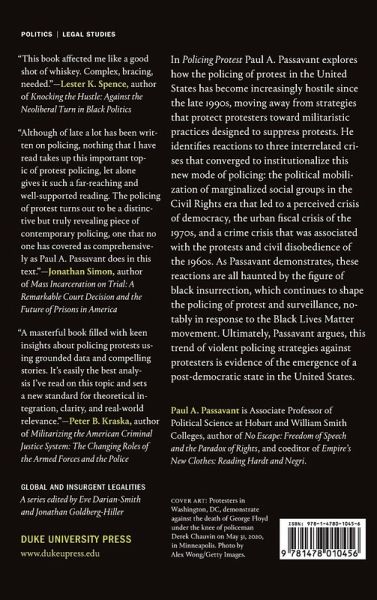 In Policing Protest Paul A. Passavant explores how the policing of protest in the United States has become increasingly hostile since the late 1990s, moving away from strategies that protect protesters toward militaristic practices designed to suppress protests. He identifies reactions to three interrelated crises that converged to institutionalize this new mode of policing: the political mobilization of marginalized social groups in the Civil Rights era that led to a perceived crisis of democracy, the urban fiscal crisis of the 1970s, and a crime crisis that was associated with protests and civil disobedience of the 1960s. As Passavant demonstrates, these reactions are all haunted by the figure of black insurrection, which continues to shape policing of protest and surveillance, notably in response to the Black Lives Matter movement. Ultimately, Passavant argues, this trend of violent policing strategies against protesters is evidence of the emergence of a post-democratic state in the United States.
