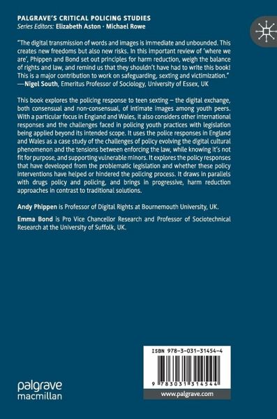 This book explores the policing response to teen sexting - the digital exchange, both consensual and non-consensual, of intimate images among youth peers. With a particular focus in England and Wales, it also considers other international responses and the challenges faced in policing youth practices with legislation being applied beyond its intended scope. It uses the police responses in England and Wales as a case study of the challenges of policy evolving the digital cultural phenomenon and the tensions between enforcing the law, while knowing it's not fit for purpose, and supporting vulnerable minors. It explores the policy responses that have developed from the problematic legislation and whether these policy interventions have helped or hindered the policing process. It draws in parallels with drugs policy and policing, and brings in progressive, harm reduction approaches in contrast to traditional solutions.