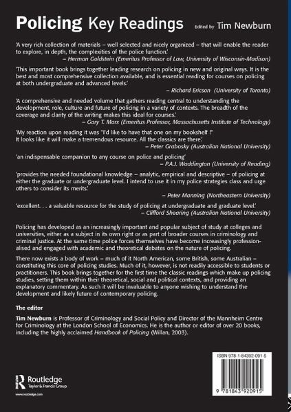 Policing has developed as an increasingly important and popular subject of study at colleges and universities in western societies, either as a subject in its own right or as part of broader courses in the field of criminology and criminal justice. This book aims to bring together the key readings which constitute the core of policing studies, setting them within the necessary theoretical, social and political context, and providing an explanatory commentary. The book is divided into five major sections: ¿ the history of policing: focusing on the emergence of the police in the USA and the UK, but including several readings on other policing systems; ¿ the role of the police: in particular the balance of tension between crime fighting, order maintenance and other forms of service, and how these arguments have developed historically; ¿ organisation and culture: how these are theorised and understood, considering arguments about the need for reform; ¿ approaches to policing: from crackdowns and the 'broken windows' theory, through zero tolerance to community policing; ¿ policing futures: debates about the future shape of policing, including work on risk, actuarialism and post-Keynesianism, and the debate on how current trends are to be understood.