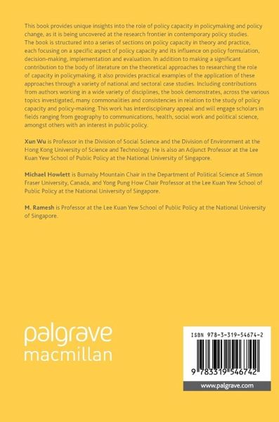 1: Policy Capacity: Conceptual Framework and Essential Components; Wu Xun, M Ramesh and Michael Howlett.- Part I - Conceptual and Measurement Issues.- 2: Policy Capacity in Public Administration; B. Guy Peters.- 3: Policy Analytical Capacity: The Supply and Demand for Policy Analysis in Government; Michael Howlett.- 4: Measuring Policy Capacity through Governance Indices; Kris Hartley and Jingru Zhang.- 5: Measuring Policy Analytical Capacity for the Environment: A Case for Engaging New Actors; Angel Hsu.- Part II - Theoretical and Empirical Issues.- 6: Innovation and the State: Towards an Evolutionary Theory of State Capacity; Erkki Karo and Reiner Kattel.- 7: The Role of Analysts in Public Agencies: Toward an Empirically Grounded Typology; Karol Olejniczak, Pawel Sliwowski and Rafal Trzcinski.- 8: Policy Analytical Practice Investigated: Exploring Sectoral Patterns in Use of Policy Analytical Techniques; Ellen Fobé, Valerie Pattyn and Marleen Brans.- 9: Government's Credible Accountability and Strategic Policy Capacity: Evidence from the Asian NICs of Taiwan, South Korea, Malaysia, and Singapore; Fiona Yap.- 10: Does Political Legitimacy Matter for Policy Capacity? A Cross-National Study of Perceived Legitimacy; Honorata Mazepus.- 11: Interest Groups and Policy Capacity: Modes of Engagement, Policy Goods and Networks; Carsten Daugbjerg, Bert Fraussen and Darren Halpin.- Part III - Case Studies.- 12: Building Organizational Political Capacity through Policy Learning: Communicating with Citizens on Health and Safety in the UK; Claire A. Dunlop.- 13: Exploring Capacity for Strategic Policy Work: Water Policy in Australia; Yvette Bettini and Brian Head.- 14: Philanthropic Foundations in the City Policy Process: a Perspective on Policy Capacity from the United States; Madeleine Pill.- 15: Policy Capacity within a Federation: The Case of Australia; Scott Brenton.- 16: Dynamic Mechanisms for Resolving Collective Incidents in China: A Policy Capacity Analysis; Jieren Hu, Guoqin Wang and Jingyan Fei.- 17: Policy-Related Expertise and Policy Work in Czech Political Parties: Theory and Methods; Martin Polasek, Vilém Novotny, and Michel Perottino.- 18: The Dynamic Nature of Policy Capacity: Internet Policy in Italy, Belarus and Russia; Nina Belyaeva.-