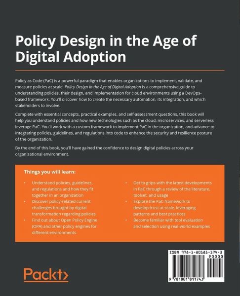 A proven methodology to build a PolicyOps function and public policy design frameworks for digital adoption, supporting your organization's journey into new paradigms and service models such as Cloud, SaaS, CaaS, FaaS, and DevOps Key Features:Understand and define policies that can be consumed across the business Leverage a framework to embed Policy as Code into the organization Learn how to use Open Policy Agent and its powerful policy language, Rego Book Description: Policy as Code (PaC) is a powerful paradigm that enables organizations to implement, validate, and measure policies at scale. Policy Design in the Age of Digital Adoption is a comprehensive guide to understanding policies, their design, and implementation for cloud environments using a DevOps-based framework. You'll discover how to create the necessary automation, its integration, and which stakeholders to involve. Complete with essential concepts, practical examples, and self-assessment questions, this book will help you understand policies and how new technologies such as cloud, microservices, and serverless leverage Policy as Code. You'll work with a custom framework to implement PaC in the organization, and advance to integrating policies, guidelines, and regulations into code to enhance the security and resilience posture of the organization. You'll also examine existing tools, evaluate them, and learn a framework to implement PaC so that technical and business teams can collaborate more effectively. By the end of this book, you'll have gained the confidence to design digital policies across your organizational environment. What You Will Learn:Understand policies, guidelines, regulations and how they fit together in an organization Discover policy-related current challenges brought by digital transformation regarding policies Find out about Open Policy Engine (OPA) and other policy engines for different environments Get to grips with the latest developments in PaC through a review of the literature, toolset, and usage Explore the PaC framework to develop trust at scale, leveraging patterns and best practices Become familiar with tool evaluation and selection using real-world examples Who this book is for: From decision-makers, such as chief information officers (CIOs) and chief information security officers (CISOs) responsible for affecting change horizontally in an organization, to cloud and DevOps architects and engineers, this book will help professionals involved in designing, implementing, and measuring policies in their organizations. A basic understanding of concepts such as cloud-native technologies, Infrastructure as Code, DevOps, and automation is necessary to get started with this book.