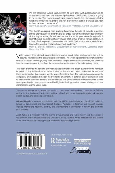 Voters expect their elected representatives to pursue good policy and presume this will be securely founded on the best available knowledge. Yet when representatives emphasize their reliance on expert knowledge, they seem to defer to people whose authority derives, not politically from the sovereign people, but from the presumed objective status of their disciplinary bases. This book examines the tensions between political authority and expert authority in the formation of public policy in liberal democracies. It aims to illustrate and better understand the nature of these tensions rather than to argue specific ways of resolving them. The various chapters explore the complexity of interaction between the two forms of authority in different policy domains in order to identify both common elements and differences. The policy domains covered include: climate geoengineering discourses; environmental health; biotechnology; nuclear power; whaling; economic management; and the use of force. This volume will appeal to researchers and to convenors of post-graduate courses in the fields of policy studies, foreign policy decision-making, political science, environmental studies, democratic system studies, and science policy studies.