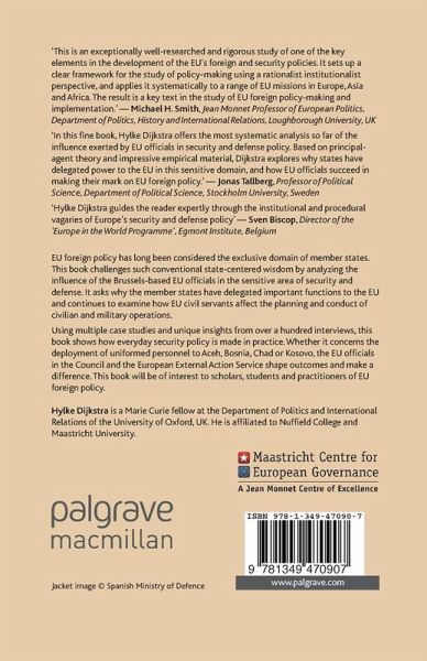 "This is an exceptionally well-researched and rigorous study of one of the key elements in the development of the EU's foreign and security policies. It sets up a clear framework for the study of policy-making using a rationalist institutionalist perspective, and applies it systematically to a range of EU missions in Europe, Asia and Africa. The result is a key text in the study of EU foreign policy-making and implementation." - Michael H. Smith, Jean Monnet Professor of European Politics, Department of Politics, History and International Relations, Loughborough University, UK "In this fine book, Hylke Dijkstra offers the most systematic analysis so far of the influence exerted by EU officials in security and defense policy. Based on principal-agent theory and impressive empirical material, Dijkstra explores why states have delegated power to the EU in this sensitive domain, and how EU officials succeed in making their mark on EU foreign policy." - Jonas Tallberg, Professor of Political Science, Department of Political Science, Stockholm University, Sweden "Hylke Dijkstra guides the reader expertly through the institutional and procedural vagaries of Europe's security and defense policy" - Sven Biscop, Director of the 'Europe in the World Programme', Egmont Institute, Belgium