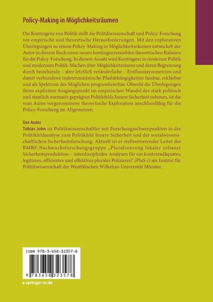 Die Kontingenz von Politik stellt die Politikwissenschaft und Policy-Forschung vor empirische und theoretische Herausforderungen. Mit den explorativen Überlegungen zu einem Policy-Making in Möglichkeitsräumen entwickelt der Autor in diesem Buch einen neuen kontingenzsensiblen theoretischen Rahmen für die Policy-Forschung. In diesem Ansatz wird Kontingenz in moderner Politik und modernem Politik-Machen über Möglichkeitsräume und deren Begrenzung durch bestehende - aber letztlich veränderliche - Einflussasymmetrien und damit verbundene indeterministische Pfadabhängigkeiten fassbar, erklärbar und als Spektrum des Möglichen prognostizierbar. Obwohl die Überlegungen ihren expliziten Ausgangspunkt im empirischen Wandel des stark politisch und staatlich normativ geprägten Politikfelds Innere Sicherheit nehmen, ist die vom Autor vorgenommene theoretische Exploration anschlussfähig für die Policy-Forschung im Allgemeinen.
