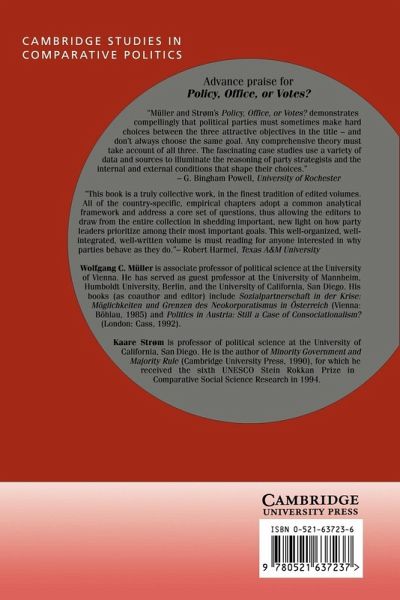Leaders of political parties often have to choose between conflicting objectives, such as influence on policy, control of the government, and support among the voters. This book examines the behavior of political parties in situations where they experience conflict between two or more important objectives. The volume contains a theoretical introduction and case studies of party leaders in Germany, Italy, France and Spain as well as six smaller European democracies. Each case focuses on the behavior of one of several parties in situations of goal conflict, such as the 'historic compromise' in Italy, the 1982 Wende in West Germany, the making of the new Swedish constitution in the 1970s, and the termination of the Austrian 'black-red' grand coalition. In their conclusions, the editors discuss how such leadership decisions can be understood and examine the causes of different choices among party leaders.