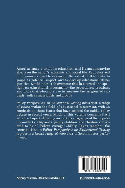 This book deals with a range of issues within the field of educational assessment, with an emphasis on those issues that have sparked the public policy debate in recent years. Much of this volume concerns itself with the impact of testing on various subgroups of the population - blacks, Hispanics, young children, and children considered to be of `below average' ability. Taken together, the contributions to this volume represent a broad range of views on differential test performance.