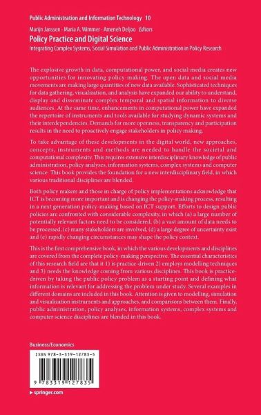 The explosive growth in data, computational power, and social media creates new opportunities for innovating the processes and solutions of Information and communications technology (ICT) based policy-making and research. To take advantage of these developments in the digital world, new approaches, concepts, instruments and methods are needed to navigate the societal and computational complexity. This requires extensive interdisciplinary knowledge of public administration, policy analyses, information systems, complex systems and computer science. This book provides the foundation for this new interdisciplinary field, in which various traditional disciplines are blending. Both policy makers, executors and those in charge of policy implementations acknowledge that ICT is becoming more important and is changing the policy-making process, resulting in a next generation policy-making based on ICT support. Web 2.0 and even Web 3.0 point to the specific applications of social networks,semantically enriched and linked data, whereas policy-making has also to do with the use of the vast amount of data, predictions and forecasts, and improving the outcomes of policy-making, which is confronted with an increasing complexity and uncertainty of the outcomes. The field of policy-making is changing and driven by developments like open data, computational methods for processing data, opining mining, simulation and visualization of rich data sets, all combined with public engagement, social media and participatory tools.