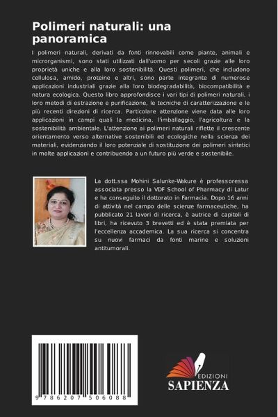 I polimeri naturali, derivati da fonti rinnovabili come piante, animali e microrganismi, sono stati utilizzati dall'uomo per secoli grazie alle loro proprietà uniche e alla loro sostenibilità. Questi polimeri, che includono cellulosa, amido, proteine e altri, sono parte integrante di numerose applicazioni industriali grazie alla loro biodegradabilità, biocompatibilità e natura ecologica. Questo libro approfondisce i vari tipi di polimeri naturali, i loro metodi di estrazione e purificazione, le tecniche di caratterizzazione e le più recenti direzioni di ricerca. Particolare attenzione viene data alle loro applicazioni in campi quali la medicina, l'imballaggio, l'agricoltura e la sostenibilità ambientale. L'attenzione ai polimeri naturali riflette il crescente orientamento verso alternative sostenibili ed ecologiche nella scienza dei materiali, evidenziando il loro potenziale di sostituzione dei polimeri sintetici in molte applicazioni e contribuendo a un futuro più verde e sostenibile.