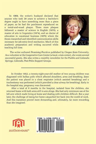 In October 1952, a twenty-eight-year-old mother of two young children was diagnosed with bulbar polio which affected shoulders, arms and breathing. Soon the patient was placed in a chest respirator (which assisted breathing) and a tracheotomy was performed (which provided a clear airway for breathing). Early in the hospital stay, pregnancy was discovered. After a total of 8 months in the hospital, isolated from the children, she returned home with both arms still in arm slings. She had only minimum use of the left arm which made living at home and dealing with children difficult. But a year later, the challenge of losing her home catapulted her back into the world of work. And this transition proved more demanding and, ultimately, far more rewarding than she imagined.