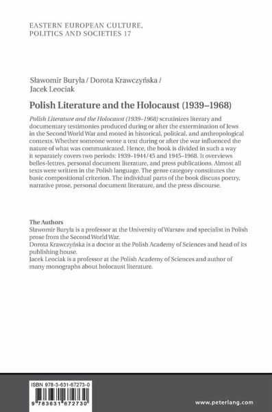 Polish Literature and the Holocaust (1939-1968) scrutinizes literary and documentary testimonies produced during or after the extermination of Jews in the Second World War and rooted in that historical, political, and anthropological context. Whether someone wrote a text during or after the war influenced the nature of what was communicated. Hence, the authors divided this publication to separately cover two periods: 1939-1944/45 and 1945-1968. This publication overviews belles-lettres, personal document literature, and press publications. Almost all texts were written in the Polish language. The genre category constitutes the basic compositional criterion. The individual parts of our publication discuss poetry, narrative prose, personal document literature, and the press discourse.