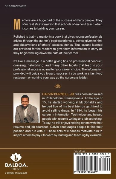 Mentors are a huge part of the success of many people. They offer real life information that schools often don't teach when it comes to building your career. Polished is that - a mentor in a book that gives young professionals advice through the author's past experiences, advice given to him, and observations of others' success stories. The lessons learned are provided for the readers to give them information to carry as they begin walking down the path of their career. It's like a message in a bottle giving tips on professional conduct, dressing, networking, and many other facets that lead to…mehr