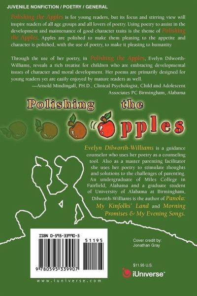 Polishing the Apples is for young readers, but its focus and stirring view will inspire readers of all age groups and all lovers of poetry. Using poetry to assist in the development and maintenance of good character traits is the theme of Polishing the Apples. Apples are polished to make them pleasing to the appetite and character is polished, with the use of poetry, to make it pleasing to humanity. Through the use of her poetry, in Polishing the Apples, Evelyn Dilworth-Williams, reveals a rich treatise for children who are embracing developmental issues of character and moral development. Her poems are primarily designed for young readers yet are easily enjoyed by mature readers as well.--Arnold Mindingall, PH.D., Clinical Psychologist, Child and Adolescent Associates PC Birmingham, Alabama.