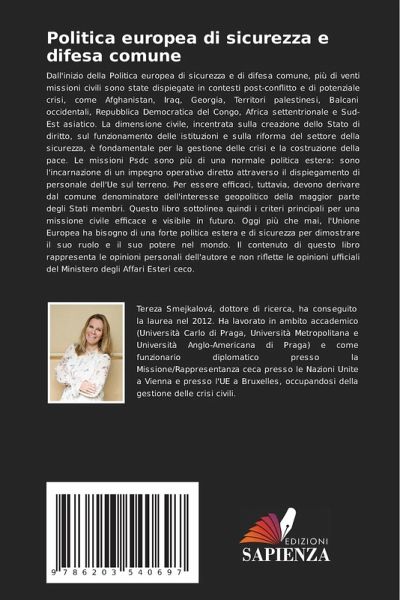 Dall'inizio della Politica europea di sicurezza e di difesa comune, più di venti missioni civili sono state dispiegate in contesti post-conflitto e di potenziale crisi, come Afghanistan, Iraq, Georgia, Territori palestinesi, Balcani occidentali, Repubblica Democratica del Congo, Africa settentrionale e Sud-Est asiatico. La dimensione civile, incentrata sulla creazione dello Stato di diritto, sul funzionamento delle istituzioni e sulla riforma del settore della sicurezza, è fondamentale per la gestione delle crisi e la costruzione della pace. Le missioni Psdc sono più di una normale politica estera: sono l'incarnazione di un impegno operativo diretto attraverso il dispiegamento di personale dell'Ue sul terreno. Per essere efficaci, tuttavia, devono derivare dal comune denominatore dell'interesse geopolitico della maggior parte degli Stati membri. Questo libro sottolinea quindi i criteri principali per una missione civile efficace e visibile in futuro. Oggi più che mai, l'Unione Europea ha bisogno di una forte politica estera e di sicurezza per dimostrare il suo ruolo e il suo potere nel mondo. Il contenuto di questo libro rappresenta le opinioni personali dell'autore e non riflette le opinioni ufficiali del Ministero degli Affari Esteri ceco.