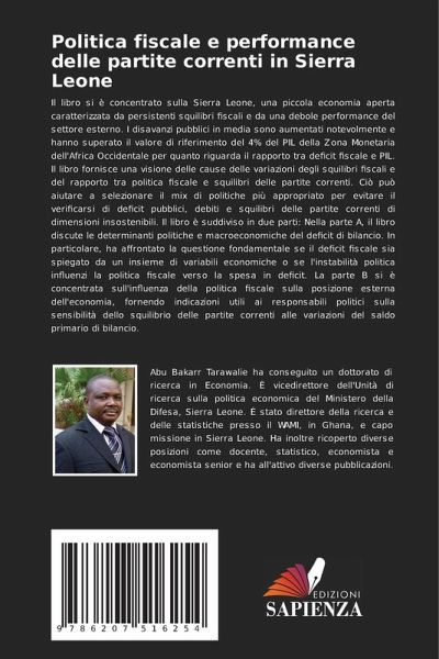 Il libro si è concentrato sulla Sierra Leone, una piccola economia aperta caratterizzata da persistenti squilibri fiscali e da una debole performance del settore esterno. I disavanzi pubblici in media sono aumentati notevolmente e hanno superato il valore di riferimento del 4% del PIL della Zona Monetaria dell'Africa Occidentale per quanto riguarda il rapporto tra deficit fiscale e PIL. Il libro fornisce una visione delle cause delle variazioni degli squilibri fiscali e del rapporto tra politica fiscale e squilibri delle partite correnti. Ciò può aiutare a selezionare il mix di politiche più appropriato per evitare il verificarsi di deficit pubblici, debiti e squilibri delle partite correnti di dimensioni insostenibili. Il libro è suddiviso in due parti: Nella parte A, il libro discute le determinanti politiche e macroeconomiche del deficit di bilancio. In particolare, ha affrontato la questione fondamentale se il deficit fiscale sia spiegato da un insieme di variabili economiche o se l'instabilità politica influenzi la politica fiscale verso la spesa in deficit. La parte B si è concentrata sull'influenza della politica fiscale sulla posizione esterna dell'economia, fornendo indicazioni utili ai responsabili politici sulla sensibilità dello squilibrio delle partite correnti alle variazioni del saldo primario di bilancio.