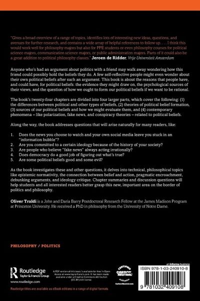 The book's twenty-four chapters are divided into four larger parts, which cover the following: (1) the differences between political and other types of beliefs, (2) theories of political belief formation, (3) sources of our political beliefs and how we might evaluate them, and (4) contemporary phenomena - like polarization, fake news, and conspiracy theories - related to political beliefs.