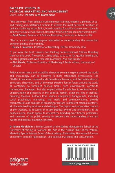 Political uncertainty and instability characterise many regions around the world and, increasingly, can be observed in more established democracies. The COVID-19 pandemic, national and international tensions, and the proliferation of autocratic, chauvinist, and, at the most extreme, fascist forces around the world all contribute to turbulent political times. Such environments constitute tremendous challenges, but also opportunities for scholars to contribute to an understanding of processes in the political market, using the lens of political branding theories. Authors from various disciplinary backgrounds, including social psychology, marketing, and media and communications, provide commentaries and analyses of branding processes in different national contexts, all characterised by tensions and challenges. The topical and provocative content of the chapters, all focusing on recent political events and phenomena in the political arena, should appeal to researchers, branding practitioners, politicians, and members of the public seeking to deepen their understanding of current events and political branding concepts.