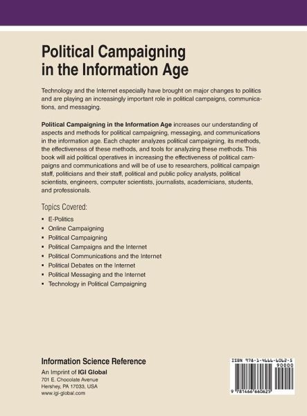 Technology and the Internet especially have brought on major changes to politics and are playing an increasingly important role in political campaigns, communications, and messaging. Political Campaigning in the Information Age increases our understanding of aspects and methods for political campaigning, messaging, and communications in the information age. Each chapter analyzes political campaigning, its methods, the effectiveness of these methods, and tools for analyzing these methods. This book will aid political operatives in increasing the effectiveness of political campaigns and communications and will be of use to researchers, political campaign staff, politicians and their staff, political and public policy analysts, political scientists, engineers, computer scientists, journalists, academicians, students, and professionals.