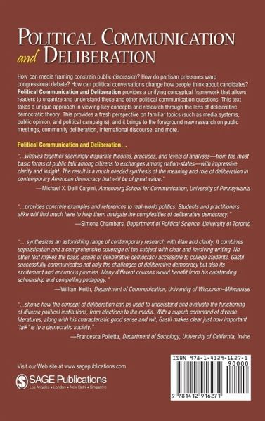 "Professor Gastil has been a leading voice in the deliberative democracy movement for the last 15 years, and with this book he has created a wonderful resource that adeptly captures the broad, valuable work being done both inside and outside academia concerning public deliberation and political communication. I hope this book will help spark a whole new generation of courses focused on this critical topic." —Martín Carcasson, Colorado State University The act of deliberation is the act of reflecting carefully on a matter and weighing the strengths and weaknesses of alternative solutions to a problem. It aims to arrive at a decision or judgment based not only on facts and data but also on values, emotions, and other less technical considerations. Though a solitary individual can deliberate, it more commonly means making decisions together, as a small group, an organization, or a nation. Political Communication and Deliberation takes a unique approach to the field of political communication by viewing key concepts and research through the lens of deliberative democratic theory. This is the first text to argue that communication is central to democratic self-governance primarily because of its potential to facilitate public deliberation. Thus, it offers political communication instructors a new perspective on familiar topics, and it provides those teaching courses on political deliberation with their first central textbook. This text offers students practical theory and experience, teaching them skills and giving them a more direct understanding of the various subtopics in public communication. Companion Web site! A dedicated Web site at http://ideliberate.la.psu.edu/ inventories everything that might be useful for instructors using Political Communication and Deliberation in their courses. Syllabi suggestions show how to use the book when teaching on a semester - or a quarter-long course, as well as a set of classroom exercises and larger projects that have been used in previous courses. Also, a wiki and forum let instructors exchange teaching ideas, links, and new content to supplement each chapter.