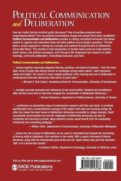 The act of deliberation is the act of reflecting carefully on a matter and weighing the strengths and weaknesses of alternative solutions to a problem. It aims to arrive at a decision or judgment based not only on facts and data but also on values, emotions, and other less technical considerations. Though a solitary individual can deliberate, it more commonly means making decisions together, as a small group, an organization, or a nation. Political Communication and Deliberation takes a unique approach to the field of political communication by viewing key concepts and research through the lens of deliberative democratic theory. This is the first text to argue that communication is central to democratic self-governance primarily because of its potential to facilitate public deliberation. Thus, it offers political communication instructors a new perspective on familiar topics, and it provides those teaching courses on political deliberation with their first central textbook. This text offers students practical theory and experience, teaching them skills and giving them a more direct understanding of the various subtopics in public communication.
