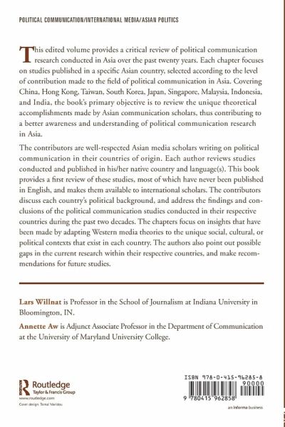 This edited volume provides a critical review of political communication research conducted in Asia over the past twenty years. Each chapter focuses on studies published in a specific Asian country, selected according to the level of contribution made to the field of political communication in Asia.