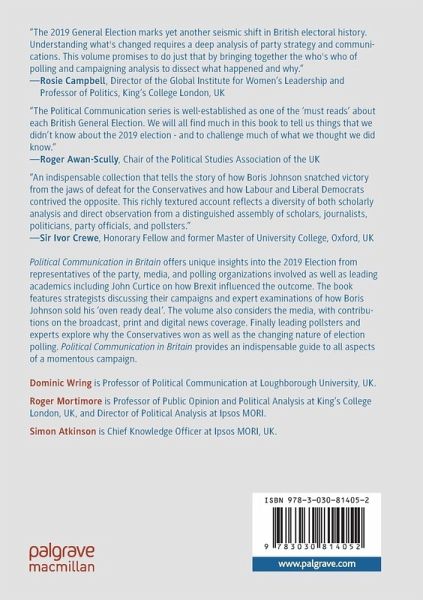 Political Communication in Britain offers unique insights from various members of the party, media, and polling organizations that contested, reported, and analysed the 2019 British General Election, as well as leading academic experts who have researched the campaign.