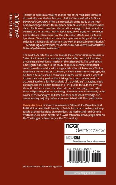 'Interest in political campaigns and the role of the media has increased dramatically over the last few years. Political Communication in Direct Democratic Campaigns offers an impressively broad study of the interactions among politicians, the media and citizens. Based on a comprehensive data collection on three direct democratic campaigns in Switzerland, the contributors to this volume offer fascinating new insights on how media and politicians interact and how this interaction affects and is affected by citizens. Given the innovative and comprehensive design of the data collection this book will influence future work on political communcation.'