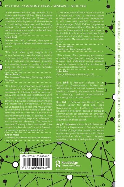Part I: Real Time Response Techniques, Approaches, and Insights Chapter 1: The History, Reliability, Validity, and Utility of Real Time Response Dan Schill Chapter 2: Collecting, Interpreting, and Analyzing Continuous Response Data Jennifer Burton, Jan Gollins, and Danielle Walls Chapter 3: Strategic Insights: The News Value of Real Time Response Measurements Rita Kirk Chapter 4: Social Media and the Rise of the Connected Voter Sean Evins Part II: Real Time Effects: Measuring Political Message Effects by the Second Chapter 5: High-Frequency Polling with Non-Representative Data Andrew Gelman, Sharad Goel, David Rothschild, and Wei Wang Chapter 6: Moment-to-Moment Responses to Race-Based Messages in Political Campaign Advertisements Stephen Maynard Caliendo, Charlton D. McIlwain, and Elizabeth Dudash-Buskirk Chapter 7: Measuring Effects of Candidates on Voters in Germany: A methodological comparison between Real-Time-Response Measurement and Facial Coding Simon Ottler, Reza Mousa-Kazemi, and René Resch Chapter 8: Scalable Multidimensional Response Measurement using a Mobile Platform Philip Resnik, Amber E. Boydstun, Rebecca A. Glazier, and Matthew T. Pietryka Part III: Partisanship and Polarization: Real Time Selective Information Processing Chapter 9: Polarization in Less than Thirty Seconds: Continuous Monitoring of Voter Response to Campaign Advertising Shanto Iyengar, Simon Jackman, and Kyu Hahn Chapter 10: Polarization in the 2012 Presidential Debates: A Moment-to-Moment, Dynamic Analysis of Audience Reactions in Ohio and Florida Amy E. Jasperson, Jan Gollins, and Danielle Walls Chapter 11: How Attacks and Defenses Resonate with Viewers' Political Attitudes in Televised Debates: An Empirical Test of the Resonance Model of Campaign Effects Marko Bachl Chapter 12: Moments of Partisan Divergence in Presidential Debates: Indicators of Verbal and Nonverbal Influence Shawn R. Hughes and Erik P. Bucy