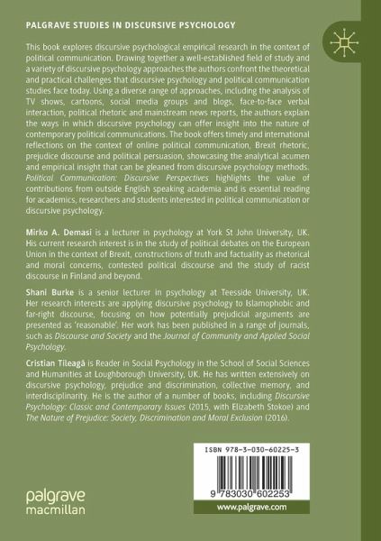 This book explores discursive psychological empirical research in the context of political communication. Drawing together a well-established field of study and a variety of discursive psychology approaches the authors confront the theoretical and practical challenges that discursive psychology and political communication studies face today. Using a diverse range of approaches, including the analysis of TV shows, cartoons, social media groups and blogs, face-to-face verbal interaction, political rhetoric and mainstream news reports, the authors explain the ways in which discursive psychology can offer insight into the nature of contemporary political communications. The book offers timely and international reflections on the context of online political communication, Brexit rhetoric, prejudice discourse and political persuasion, showcasing the analytical acumen and empirical insight that can be gleaned from discursive psychology methods.