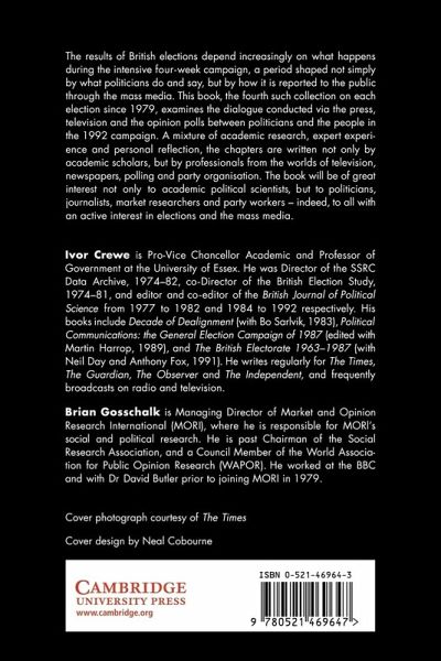 Introduction Ivor Crewe and Brian Gosschalk; Part I. The Politicians: 1. The Conservative campaign: against the odds John Wakeham; 2. The Liberal Democrats' campaign Richard Holme; 3. The Labour campaign Robin Cook; Part II. The Strategists: 4. The Conservative Party's strategy Shaun Woodward; 5. The Labour Party's strategy David Hill; 6. The Liberal Democrats' strategy Des Wilson; Part III. The Campaign on Television: 7. The parties and television Richard Tait; 8. Struggles for meaningful election communication: television journalism at the BBC, 1992 Jay G. Blumler, Michael Gurevitch and T. J. Nossiter; 9. Old values versus news values: the British 1992 general election campaign on television T. J. Nossiter, Margaret Scammell and Holli A. Semetko; 10. People metering: scientific research or clapometer? John Rentoul, Nick Robinson and Simon Braunholtz; Part IV. The Campaign in the Press: 11. 'Fact is free but comment is sacred'; or, Was it The Sun wot won it? David McKie; 12. Characters and assassinations: portrayals of John Major and Neil Kinnock in The Daily Mirror and The Sun Colin Seymour-Ure and Sandra Scott; 13. Failing to set the agenda: the role of election press conferences in 1992 Dennis Kavanagh and Brian Gosschalk; Part V. The Opinion Polls in the Campaign: 14. The polls and the 1992 general election Robert Waller; 15. The use of panel studies in British general elections Robert M. Worcester and Ivan Fallon; 16. Forecasting the 1992 election: the BBC experience John Curtice and Clive Payne; 17. The ITN exit poll Glyn Matthias and David Cowling; 18. The impact of the 1992 general election on the image of public opinion surveys Robert J. Wybrow; Part VI. Reflections: 19. Majorspeak: observations on the Prime Minister's style of speaking Max Atkinson.