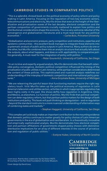 This book studies policymaking in the Latin American electricity and telecommunication sectors. Murillo's analysis of the Latin American electricity and telecommunications sectors shows that different degrees of electoral competition and the partisan composition of the government were crucial in resolving policymakers' tension between the interests of voters and the economic incentives generated by international financial markets and private corporations in the context of capital scarcity. Electoral competition by credible challengers dissuaded politicians from adopting policies deemed necessary to attract capital inflows. When electoral competition was low, financial pressures prevailed, but the partisan orientation of reformers shaped the regulatory design of market-friendly reforms. In the post-reform period, moreover, electoral competition and policymakers' partisanship shaped regulatory redistribution between residential consumers, large users, and privatized providers.