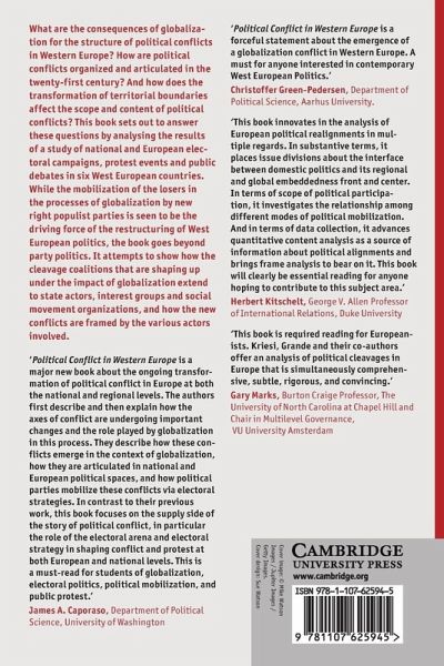 'Political Conflict in Western Europe is a major new book about the ongoing transformation of political conflict in Europe at both the national and regional levels. The authors first describe and then explain how the axes of conflict are undergoing important changes and the role played by globalization in this process. They describe how these conflicts emerge in the context of globalization, how they are articulated in national and European political spaces, and how political parties mobilize these conflicts via electoral strategies. In contrast to their previous work, this book focuses on the supply side of the story of political conflict, in particular the role of the electoral arena and electoral strategy in shaping conflict and protest at both European and national levels. This is a must-read for students of globalization, electoral politics, political mobilization, and public protest.' James A. Caporaso, University of Washington