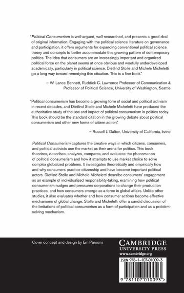 Political Consumerism captures the creative ways in which citizens, consumers and political activists use the market as their arena for politics. This book theorizes, describes, analyzes, compares and evaluates the phenomenon of political consumerism and how it attempts to use market choice to solve complex globalized problems. It investigates theoretically and empirically how and why consumers practice citizenship and have become important political actors. Dietlind Stolle and Michele Micheletti describe consumers' engagement as an example of individualized responsibility taking, examining how political consumerism nudges and pressures corporations to change their production practices, and how consumers emerge as a force in global affairs. Unlike other studies, it also evaluates if and how consumer actions become effective mechanisms of global change. Stolle and Micheletti offer a candid discussion of the limitations of political consumerism as a form of participation and as a problem-solving mechanism.