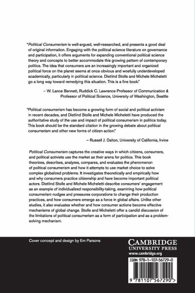 Political Consumerism captures the creative ways in which citizens, consumers and political activists use the market as their arena for politics. This book theorizes, describes, analyzes, compares and evaluates the phenomenon of political consumerism and how it attempts to use market choice to solve complex globalized problems. It investigates theoretically and empirically how and why consumers practice citizenship and have become important political actors. Dietlind Stolle and Michele Micheletti describe consumers' engagement as an example of individualized responsibility taking, examining how political consumerism nudges and pressures corporations to change their production practices, and how consumers emerge as a force in global affairs. Unlike other studies, it also evaluates if and how consumer actions become effective mechanisms of global change. Stolle and Micheletti offer a candid discussion of the limitations of political consumerism as a form of participation and as a problem-solving mechanism.