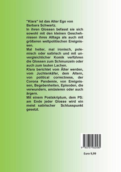 "Klara" ist das Alter Ego von Barbara Schwartz. In ihren Glossen befasst sie sich sowohl mit den kleinen Geschehnissen ihres Alltags als auch mit größeren weltpolitischen Ereignissen. Mal heiter, mal ironisch, polemisch oder satirisch und mit unvergleichlicher Komik verführen die Glossen zum Schmunzeln oder auch zum lauten Lachen. Klara berichtet vom Älter werden, den Personalschwierigkeiten im Bundestag, den Alten, der Bürokratie in Deutschland, der Corona Pandemie, Ereignissen, Begebenheiten, Episoden, die verwundern, amüsieren oder auch ärgern. Mit einem Postskriptum, dem PS: am Ende jeder Glosse wird ein meist satirischer Schlusspunkt gesetzt.